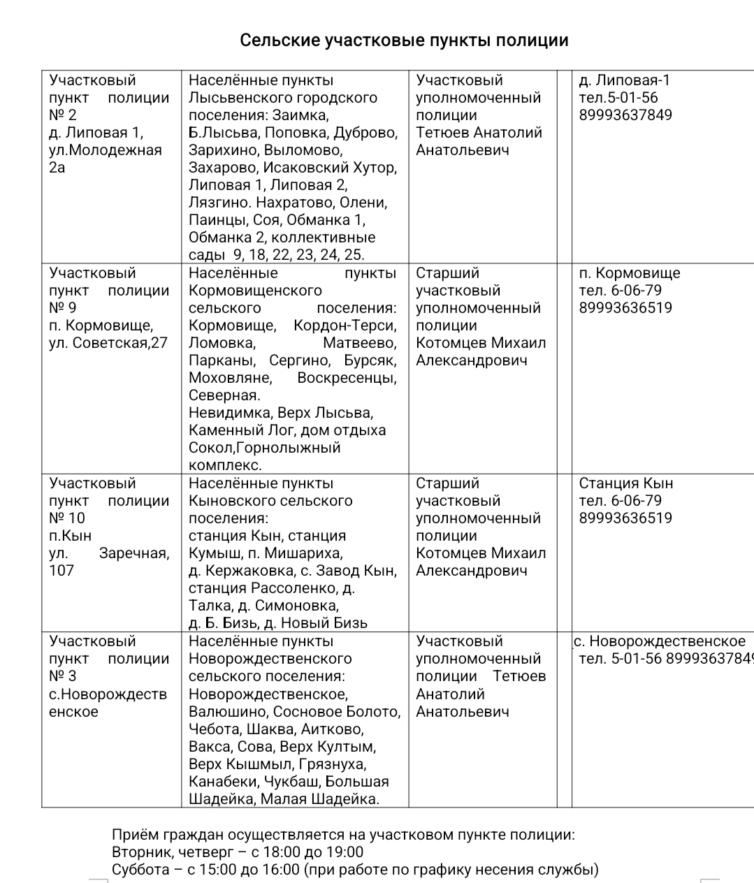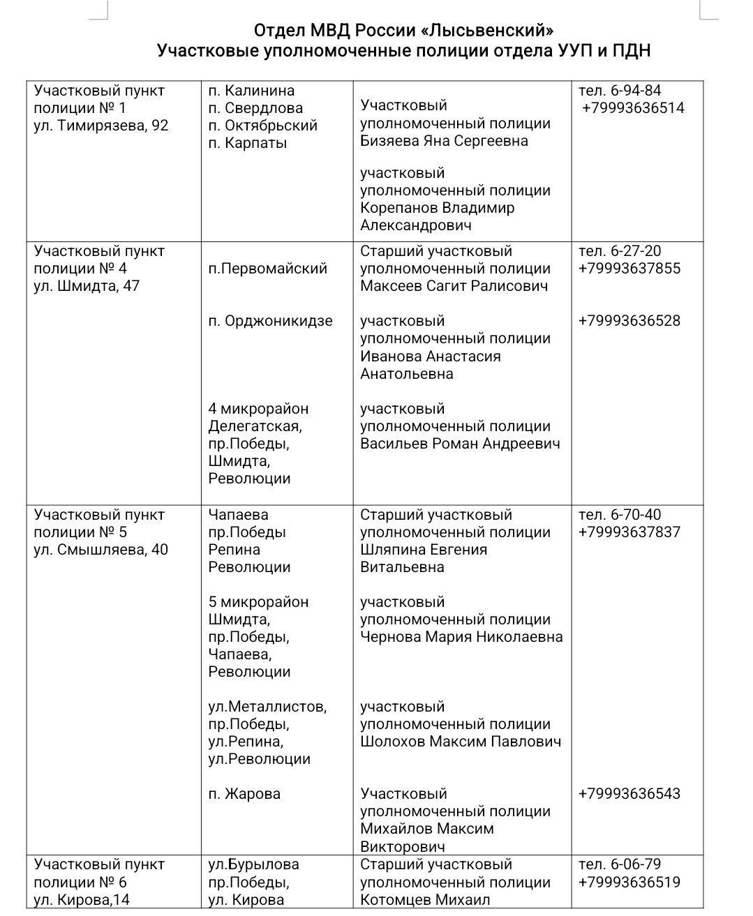 Телефоны отдела МВД